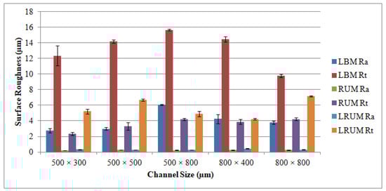 Results of surface roughness of the fabricated channels by using LBM, RUM, and combined LRUM processes.