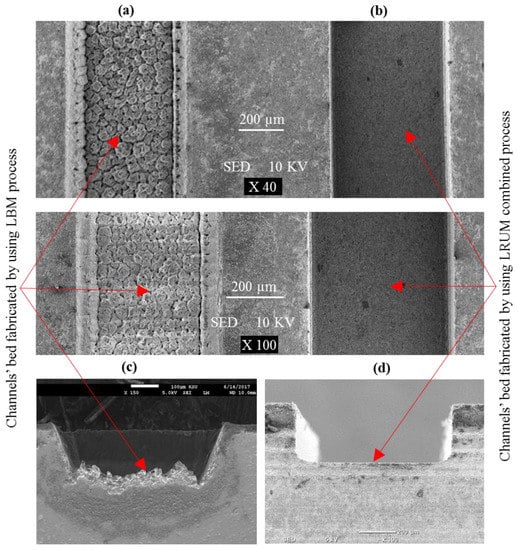 Comparison of the surface morphology of the fabricated channels by using LRUM comparing to LBM, (a,b) channels’ bed, (c,d) channels’ side.
