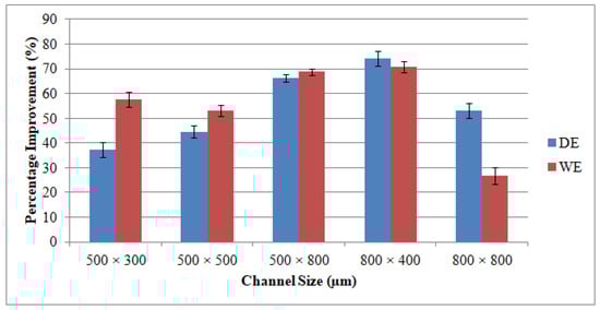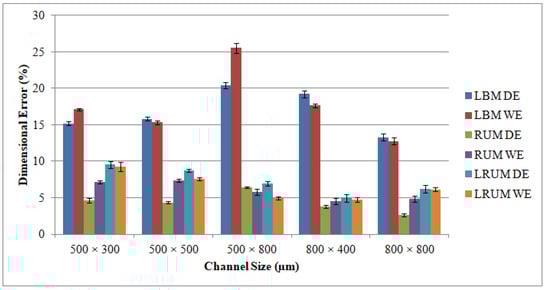 The graphs appear in Figure 12 encompass details on dimensional accuracy for different channels in terms of DE and WE. It must be emphasized that the channel width presumed in this study is the bottom width (see Figure 4), because the top widths produced have been found to meet the intended widths for all channel sizes. It simply indicates that there is no issue with the shielding effect of the molten material on the top surface and that the laser provides completely focused energy. In addition, the problem of tool wear is not detected at the beginning of machining the first cutting depth in RUM. In LBM, the DE is discovered to be positive (overcut), i.e., if the channel depths are lower than the channel widths, the depths created are larger than the depths intended. It appeared at channel sizes of 500 μm × 300 μm, 500 μm × 500 μm, and 800 μm × 400 μm. In contrast, the DEs are spotted to be negative (undercut), i.e., the depths produced are smaller than the expected depths if the depths of the channel are higher than the channel widths such as the channel size of 500 μm × 800 μm. This is because the laser loses its energy when the machined depth becomes deeper. Specifically, with an increase in channel depth, the DE increased from 15.2% for a channel size of 500 μm width × 300 μm depth to reach approximately 20.5% for a channel size of 500 μm width and 800 μm depth.