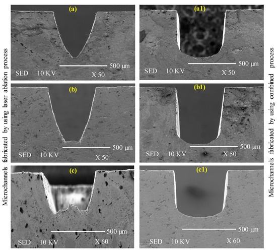Comparison of the cross-sections of the fabricated channels by using LBM and combined LRUM processes: (a–c): cross-sections of the microchannels machined by using LBM process; (a1–c1): cross-sections of the microchannels machined by using LRUM combined process.