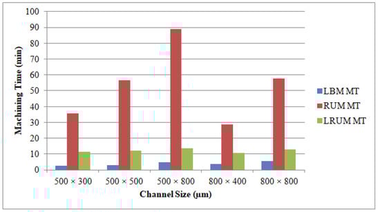 The LBM process contributes to the least MT amongst the three machining technologies that were deployed. Even though the LRUM process produced a higher MT relative to the LBM process, it is substantially superior in terms of MT as opposed to RUM. For instance, in the LRUM procedure, the MT decreases from 84.9 min (in RUM) to 12.7 min. The selected channel widths are equal to the outer diameters of the RUM tool in the RUM process. The 800 μm tool diameter is more robust than the 500 μm tool and depending on RUM’s optimum process parameters the selected feed rate and cutting depth are greater than those of the small size tool (500 μm diameter). Therefore, the MT for the channel sizes of 800 µm × 400 µm (26.8 min) and 800 µm × 800 µm (53.4 min) are smaller than 500 µm × 300 µm (3.8 min) and 500 µm × 800 µm (84.9 min) respectively. The percentage of changes made in the MT by using the LRUM process as opposed to the RUM process’s MT can be observed in Figure 16.