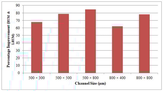 Percentage of improvement in the surface roughness of the fabricated channels by using LRUM comparing to LBM.