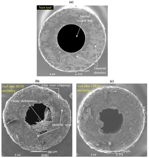 The comparisons of the new RUM tool, the tool after machining twelve channels by using RUM, and the tool used for finishing twelve channels by using LRUM processes are depicted in Figure 17. Figure 17a provides the end-cutting-face perspective of the new tool, in which the diamond abrasives and bonding material can be easily viewed. It implies that the tool exhibits uniform inner and outer radii as well as a fairly sharp cutting edge. The end cutting edge of the tool used in the LRUM process is shown in Figure 17b in which attritions wear, edge chipping, and rounding of tools can be observed, and these wear mechanisms have also been documented in [67,68]. In addition, it is clear in Figure 17b that, due to the increased pressure on the tool end face during machining, some of the tool bonding material along with the diamond abrasive are plastically deformed and dragged through the coolant hole. Such tool wear can adversely affect the coolant efficiency of the tool owing to the coolant passage obstruction. Figure 17c shows the end cutting edge of the tool used for finishing twelve channels by using the LRUM process. It can be noted that there is a minimal rounded edge and less plastic deformation during machining under the LRUM process. It must be mentioned that the length of the tool is recalibrated by the integrated DMG laser tool length calibration device after every microchannel is machined.