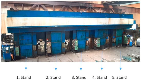 Figure 1 shows a five-stand cold-rolling tandem mill in which the presented research was carried out. Entry maximum thickness of strip is 3.8 mm exit thickness is maximum 1.75 mm, depending on the rolled steel grade. The research was carried out on tinplate steel grades, such as TH620N, TH415, TH550, TS290, TS245, and others. Tinplate grades are the most critical ones due to their very low thickness, around 0.175 mm, i.e., the thickness is comparable to a paper sheet.