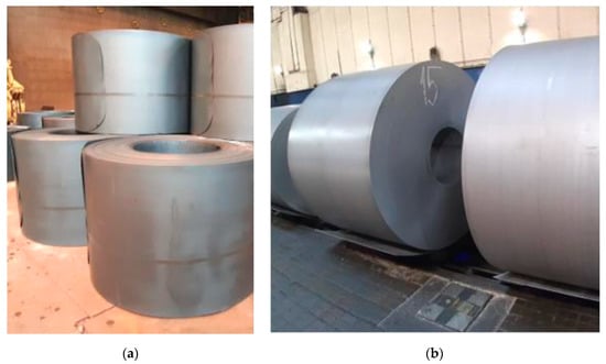 The cold-rolling process is preceded by pickling. The pickling process is a process when oxides and other foreign materials are removed from the surface of a steel strip using acid solution. Figure 2a shows that the hot-rolled steel strip surface is dark, caused by oxides, and sometimes there is corrosion. Additionally, grease can occur. The cleaning of the strip surface is necessary for further production operations. Figure 2b shows coils with pickled surfaces.