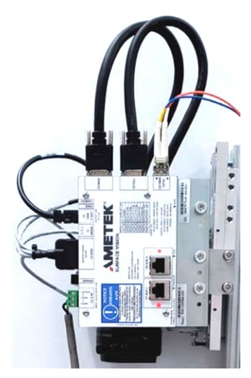 Figure 3 shows the camera with Camera Link Interface module (AMETEK Surface Vision, Hayward, WI, USA) which is installed at the pickling line. In total, eight cameras were installed at the pickling line: four on the top side and four on the bottom side.