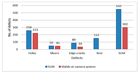 The classification helps determine what defects are critical in the rolling process. System is able to identify defects that are present on strip surface and to predict the risk degree they pose to the rolling process. Figure 5 shows correlation of broken strips and defects visible on strip during pickling was made. There were 550 defects in the database; of that, 302 defects were visible on camera system records. The analysis shows, that preventive actions could have been implemented to prevent an incident during cold-rolling process. The data are displayed in Figure 5. The defects visible on camera records were present on 54.9% of defective coils.