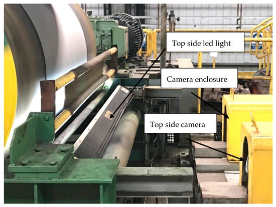 High-speed cameras were installed at Pickling Line Ametek SmartView®-Surface Inspection system (Hayward, WI, USA) with 6 K cameras; Ametek SmartView® scans the surface of the strip and categorizes the defects. The cameras are mounted in a protective enclosure against damage Figure 6. The surface of the strip lit by an LED light.