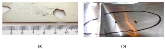 Samples from metallographic analysis (a) Holes in the strip after metallurgical sliver falls out after the rolling process (cm); (b) Holes in the strip after metallurgical sliver falls out after the rolling process.