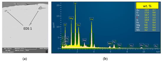 EDS, Energy-dispersive X-ray spectroscopy analyses of foreign fragments of samples: (a) Foreign particles in the steel substrate in the damaged area where the EDS analysis was performed (b) Results of EDS analysis, chemical elements detected by EDS analysis.