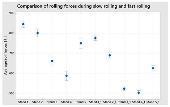 The difference between the two rolling modes is clearly visible. When rolling at the stable speed of 1250 m/min, the rolling forces have a smaller scatter and the rolling process is more stable than when the rolling process slows down. The most significant finding is that the value of the rolling forces, i.e., the factor that most significantly influences the factors that negatively influence the rolled strip from the perspective of the potential destruction of a strip with a critical defect in the rolling process. The overall rolling forces at each stand are significantly higher at a lower rolling speed.
