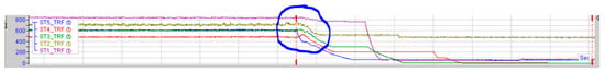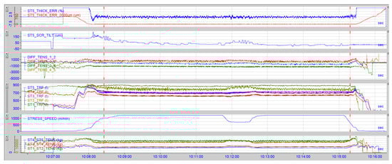 In Figure 13, one can observe the forces captured by the Iba analyzer during the rolling process when the rolling was reduced; the ST5_THICK_ERR value displays the discrepancy from the requested strip thickness. It is clearly visible that the thickness was oscillating when the speed was reduced. Even though it is within the required limits, gauge oscillation is an unwanted phenomenon. The ST5_SCR_TILT chart displays the values from Stand 5 tilting where the stand was, due to the rolling parameters’ change induced by the slow-down, tilting +70 µm. The tilting of the last stand regulates the strip flatness; any unwanted changes of tilting may have a negative impact on the strip flatness. The following charts: DIFF_TENS (different tensions), TRF (total roll force), STX_STY_TENS (tension between stands) display oscillating forces in the rolling process incurred by the rolling speed change.