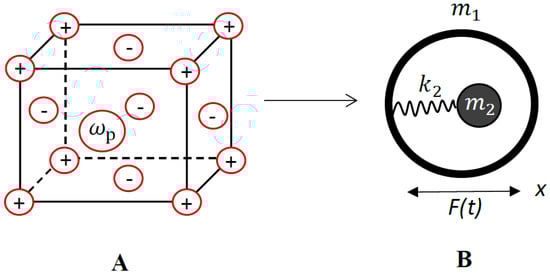 where . It is easily recognized that when the frequency approaches from above, the effective mass will be negative [20,21,23]. In our recent paper we suggested the electro-mechanical, plasmonic analogy of the aforementioned model, giving rise to the negative effective mass [18]. Consider the cubic metal particle shown in Figure 1A, seen as an atomic lattice containing the Drude–Lorenz free electron gas possessing a total mass of , where kg is the mass of electron, n is the concentration (number density) of the electron gas and V is the volume of the particle [22,24,25]. Electron gas is free to oscillate with the plasma frequency [22,24,25]. Exposing the entire metal particle to the external sinusoidal force given by . The effective mechanical scheme of the metallic particle is shown in Figure 1B and it exactly coincides with that giving rise to the negative effective mass, supplied in this case by, Equation (2):