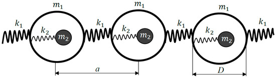 Consider now the one-dimensional lattice built from the elements (cells) shown in Figure 1B and depicted in Figure 2. The 1D lattice is built up of identical elements possessing the effective negative masses given by Equation (2) and connected by ideal springs with the elastic constant ; the separation between the elements a is constant, as shown in Figure 2.