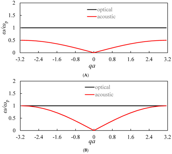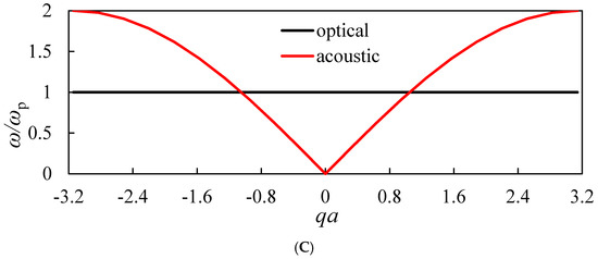 The “optical” and “acoustical” branches of longitudinal modes propagation in the 1D lattice, depicted in Figure 2 for various ratios, are shown in Figure 3A–C [26,27].