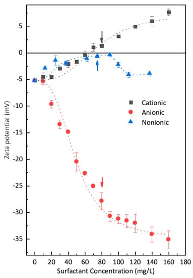 - Tkachenko, N.H.; Yaremko, Z.; Bellmann, C.; Soltys, M.M. The influence of ionic and nonionic surfactants on aggregative stability and electrical surface properties of aqueous suspensions of titanium dioxide. J. Colloid Interface Sci. 2006, 299, 686–695. [Google Scholar] [CrossRef] [PubMed]