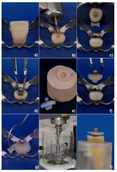 (a–i) Sequential phases of specimen preparation and testing. (a) Extracted tooth isolated with rubber dam to increase the working conditions of the operator, (b) removal of coronal part of the tooth with diamond bur at cement-enamel junction (CEJ), preparation of occlusal/incisal surface of tooth using diamond bur with light concavity in order to increase adhesive surface, (c) preparation of elliptical inlay to achieve stability and avoid rotational movement during cementing procedure, (d) checking vertical position of retentive male part (GP-Ball), (e) obtaining stone cast from silicon impression of the preparation and molding coping at the laboratory, (f) try-in of the coping, (g) cementation of the coping on the tooth, (h) positioning the specimen in the Universal Testing Device, (i) tensile test until failure of the coping.