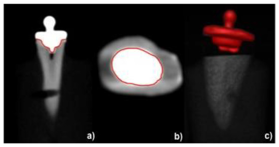 Digital volume tomography (DVT) (KaVo 3D Exam, KaVo Dental GmbH, Biberach, Germany) images were made for each tooth with a voxel size of 0.25 mm × 0.25 mm × 0.25 mm (Figure 2a–c). The goal of the DVT was to determine the shape of the interface between the materials and to calculate the surface on which the tensile strength is applied. Afterwards, the obtained images were analyzed using 3D image analysis software (AMIRA, FEI VSG, Berlin, Germany) in order to measure the adhesive interface between the resin composite copings and the prepared dentin surface. Thus, from the overall preparation, in the data analysis horizontal surfaces were neglected and only the vertical adhesive interfacial area was considered for stress calculation (Figure 3a,b).