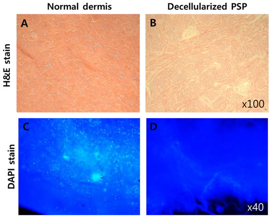 Qualitative analysis of decellularized porcine skin powder (PSP). Hematoxylin and eosin (H&E) (A,B) and diamidino-2-phenylindole (DAPI) stains (C,D) show the preserved extracellular matrix (ECM) without cells (nucleus).