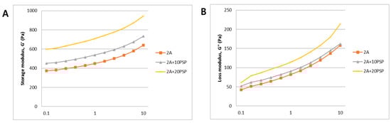 Mechanical properties of PSP-inks. The storage modulus G’ (A) and the loss modulus G” (B) were plotted logarithmically against frequency (0.1–10 Hz at 24 °C).