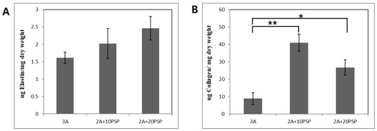 Quantitative analysis of the ECM components. Elastin contents (A) and collagen contents (B) results of the cells printed structures after 7 days of incubation. The statistical significance of differences between the 3% alginate hydrogel (3A) and PSP-inks in 2% alginate (2A+10PSP, 2A_20PSP) groups were assessed using one-way ANOVA. * p < 0.05 and ** p < 0.01.