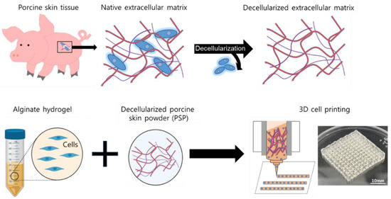 As cell-friendly materials, hydrogels have been widely used in 3D bioprinting to fabricate artificial tissues or organs. For tissue-specific bio-ink materials, researchers have developed decellularized tissue-based bio-inks to mimic the specific natural environments of various tissue types. In this study, PSP-ink composed of extracellular matrix excluding the nucleus was prepared from porcine skin tissue and confirmed to be biocompatible and useful for 3D printing.