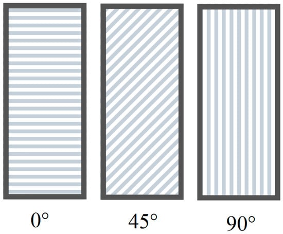 Scheme of the fabricated layers in the SLM samples according to the different building orientations—0°, 45° or 90°.