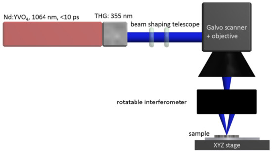The structuring of the sample surfaces was done by laser beam interference ablation, applying a special interferometer-based setup developed at Laser-Laboratorium Göttingen sketched in Figure 1. Third harmonic laser pulses from an ultrashort pulse laser (Hyper Rapid 50, Coherent, Dieburg, Germany) with a duration of ~8 ps at a wavelength of 355 nm and a repetition rate of 400 kHz were used for surface structuring. The pulses were guided through a diffractive laser scanner consisting of a fast galvanometric scanning head (intelliSCANde 14, SCANLAB GmbH, Puchheim, Germany), an objective lens, and a rotatable grating interferometer and focused onto the sample surface with a focus diameter of 30 µm. This configuration projected a well-defined, high-quality linear grating interference pattern with a period of 1.5 µm onto the workpiece where the shape of the structured area could be freely chosen by the scanning system while the direction of the grating lines could be precisely changed by rotating the interferometer around the optical axis. This allowed full control over the orientation of the grating lines without having to move the sample. Repeated irradiation of the same area at different grating orientations results in complex periodic patterns [19,20].