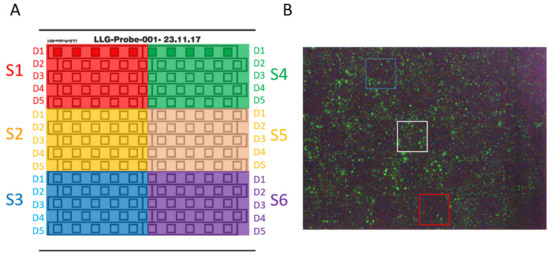 Sample preparation and examination. (A) Sample overview for the stainless-steel plates. The colored numbers outside of the square signify the six different structure types (S1–S6). Each structure is comprised of five columns and five rows, where the columns represent five different depths (D1–D5) and the rows are replicas for each structure/depth combinations. (B) Example of fluorescence microscopy image of structured (S5 D1–5) stainless steel plate. Fields with no structure (white), shallow (D1, blue), and deep structures (D5, red) are highlighted.