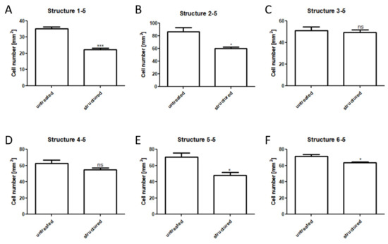 Cell adhesions on untreated and structured plates were compared and analyzed. Overall, the strongest effects were observed for the deepest combinations (data not shown). Thus, we focused on these modifications (Figure 4). Significantly reduced cell numbers per mm2 were detected for the structures 1-5 (untreated 35 ± 2 cells/mm2, structured 22.3 ± 1.5 cells/mm2), 2-5 (untreated 86.6 ± 10.4 cells/mm2 compared to 59.7 ± 4.8 cells/mm2), 5-5 (70.3 ± 9 cells/mm2 compared to 47.7 ± 6.5 cells/mm2) and 6-5 (71.3 ± 4 cells/mm2 compared to 59.9 ± 1.5 cells/mm2). For the structures 3-5 (51 ± 5.6 mm2 compared to 49.3 ± 3.8 mm2) and 4-5 (62.7 ± 6.8 mm2 compared to 54.7 ± 4.5 mm2), no significant differences were measured.