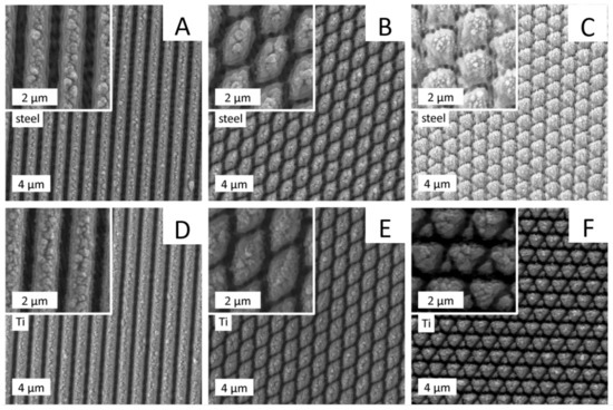 Scanning electron microscopy (SEM) examination of nanostructures. Stainless steel (A–C) and titanium (D–F) plates were analyzed using scanning electron microscopy. The following structures are shown: A and D: 1-5; B and E: 2-5; C and F: 5-5.