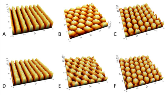 Surface topology analyzed by atomic force microscopy (AFM): (A–C): structures on stainless steel; (D–E): structures on titanium; A&D: structure 1-5; B&E: structure 2-5; C&F: structure 5-5. Stainless steel showed at least 100 nm deeper structures then titanium for these structure types.
