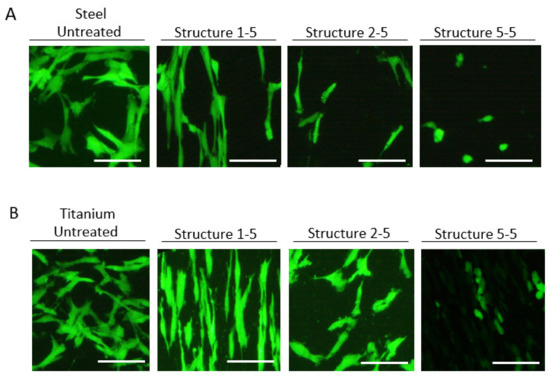Cell adhesion of human MSCs was significantly reduced by several configurations of surface modification (Figure 4). Three surface topographies that exhibited the highest reduction of cell adhesion were selected for further analysis (structures 1-5, 2-5, and 5-5). It was confirmed that cell morphology was altered markedly depending on the surface structure (Figure 7). This is in line with other reports where reduced cell adhesion and increased separation and orientation of murine fibroblasts were described on titanium-alloy substrates [25]. Cell adhesion is generally affected by surface proteins called cell-adhesion molecules (CAMs), which can be further categorized into integrins, immunoglobulin superfamily, cadherins, and selectins [26]. Each of these proteins recognizes different ligands, resulting in cell junctions [27]. Cells adhere to metal surfaces via focal contacts and extracellular matrix adsorption to the metal surface [25,28]. Structured metal surfaces can address three different aspects of cell adhesion [25]. First, mammalian cells generally exhibit limited flexibility, preventing the adaptation to sharp surfaces such as laser-induced spikes. Second, the CAMs are clustered to focal adhesions [29]. These focal adhesions have a sub-µm lateral dimension and typical distances up to a few µm [25]. Therefore, the contact area is limited to the spikes, which reduces the contact surface and therefore the possible adhesion force. Finally, surface treatment can lead to oxidation, limiting the adhesion of CAMs, thus reducing the cell adhesion [30].