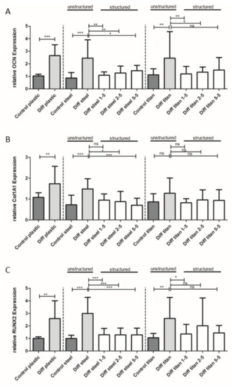 However, we observed a significant reduction of OCN expression on structured stainless-steel and titanium surfaces compared to non-structured surfaces for all tested structures except for structure 5-5 on titanium plates (Figure 8A). The reduction of Collagen 1 expression was found for structures 2-5 and 5-5 on steel, while no significant difference was observed for structure 1-5. On surface-treated titanium plates, Collagen 1 expression was not changed (Figure 8B). On the other hand, a strong reduction of RUNX2 expression compared to non-structured controls was detected for all structure types on steel plates. On titanium plates, a significant reduction of RUNX2 was observed for structure 1-5, while structure 2-5 and 5-5 did not influence RUNX2 expression (Figure 8C).