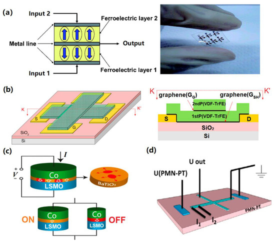 More advanced approaches to FeRAM devices: (a) the cross-sectional geometry of an FePLG (ferroelectric programmable logic gate) (left) and a photograph of an FePLG fabricated on a flexible substrate (right); (b) the three-dimensional geometry of a graphene field-effect transistor (left) and its cross-sectional view (right); (c) the structure of a ferroelectric tunnel memristor; (d) a schematic of the device structure for logic gates. ((a) is reprinted with permission from [50]; (b) is reprinted with permission from [51]; (c) is reprinted with permission from [52]; (d) is reprinted with permission from [53]).