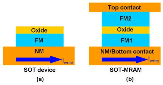 Schematic of (a) an SOT (‘spin-orbit torque’) device illustrating the write current path in the SOT scheme and (b) a SOT-MRAM cell utilizing the SOT scheme for writing and TMR (tunnel magneto-resistance) scheme for readout. FM and NM denote the ferromagnetic layer and non-magnetic layer, respectively. (Reprinted with permission from [71]).