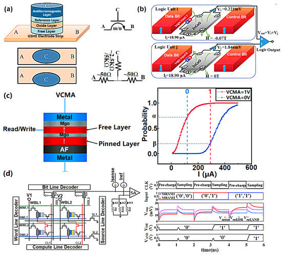 (a) The structure of a GSHE MTJ (Giant Spin-Hall Effect MTJ) (3D view (top left), top-down view (bottom left), device symbols (top right), and equivalence circuit (bottom right)); (b) schematic of the two-input logic function (NOR) in a DEMR (device diode-enhanced magnetoresistance); (c) device structure of the voltage-controlled MTJ (left) and its corresponding voltage and current signals to map Boolean logic ‘0’ and ‘1’ (right); (d) proposed SOT-MRAM based dual-mode in-memory computing architecture (left) and the resulting transient simulation of row-wise AND/OR computation. ((a) is reprinted with permission from [86]; (b) is reprinted with permission from [88]; (c) is reprinted with permission from [89]; (d) is reprinted with permission from Shaahin et al., 2018).