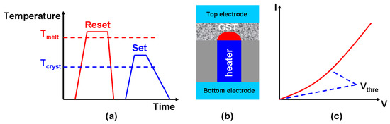 As a storage medium, Phase-Change RAM (PCRAM) is mainly based upon chalcogenide (Group VI) and pnictide (Group V) elements, in the form of Germanium-antimony-tellurium (GST) alloys such as Ge2Sb2Te5 (usually abbreviated as GST) and compositional variations of GeSb [101], GeTe [102], InSbTe [103], InGeTe [104], InSbGe, AgInSbTe [105], GeSbSeTe, GeSbReBi, SiSbTe [106], and SbTe [107]. The particularly relevant feature of these compositions, here, is that their electrical/optical properties, such as their electrical resistivity and optical reflectivity, differ sharply between their crystalline state (with a long-range atomic order) and their amorphous state (with a short-range atomic order). These two distinct states can be rapidly and reversibly switched between on the basis of temperature, making them what are known as ‘phase-change materials’ (PCMs). As shown in Figure 9a, their highly resistive amorphous state can be achieved (i.e., as a reset process) by heating their crystalline form to an appropriate melting temperature, followed by a quick cooling process. Heating amorphous PCMs to a glass transition temperature then allows for the formation of a low resistive crystalline state (i.e., as a setting process). The crystalline and amorphous states of PCMs can be defined in terms of the binary codes ‘1’ and ‘0’. The phase-transformation between their amorphous and crystalline states, which is generally induced by current pulses of an appropriate magnitude and width, is then open to being considered as the PCRAM record/write operation. The readout operation is performed by sensing variations in the resistance between phase-transformed and non-transformed regions. This is achieved by applying a readout pulse with a much lower magnitude than a write pulse.