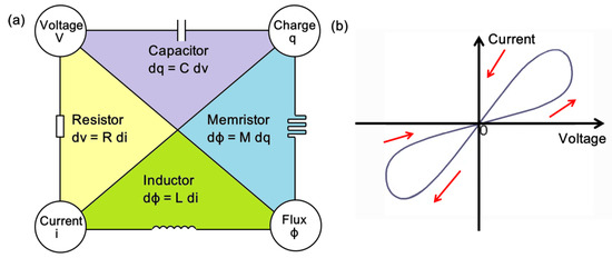 An important part of the story of the development of PCRAM is the development of what are known as ‘memristors’, literally ‘memory resistors’. These were originally theorized by Chua in 1971 [123] to be one of four fundamental electrical components, incorporating resistors, capacitors, inductors and memristors, as illustrated in Figure 11a. A memristor is effectively a two-terminal electrical component that provides for a dynamic non-linear relationship between electrical charge and magnetic flux. The characteristic of memristance associated with memristors amounts to being a charge-dependent resistance. A material that demonstrates the ideal properties of a memristor has yet to be found. However, in 2008, some 37 years after its initial conception, a nanoscale TiO2 device that mimicked the key characteristics of a memristor was developed [124] and a few years later the first functioning memristor arrays began to be constructed [125]. The most important feature of a memristor of interest here is its pinched hysteresis loop [126], where changes in the slope of the curve relate to different states of resistance (Figure 11b). This presents the possibility of rapidly switching between these different states as part of a two-terminal resistance memory. Basically, various hysteresis loop shapes can be acquired by changing the frequency or amplitude of different input signals. Centrally, the state variable of a memristor retains information about the electrical charge and magnetic flux, rather than just preserving the charge or flux itself. So, when the power is turned off, in theory at least, a memristor is able to remember its most recent state. This is the core reason why memristors offer the possibility of non-volatile storage of information. Through changes in input excitation, a memristor’s resistance is open to being dynamically modified, raising the prospect of memristors simulating the behavior of brain synapses.