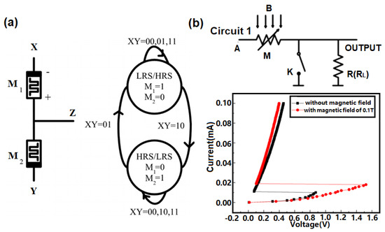 Boolean logic functions can also be handled by diode-enhanced magnetoresistance (DEMR) devices [88] (see Figure 7b). The logic unit inside a DEMR device has two L10-FePt magnets with perpendicular magnetocrystalline anisotropy, which are regarded as a data bit and a control bit, respectively. Different combinations of the magnetization direction of the control bit and the data bit, i.e., ‘up-up’, ‘up-down’, ‘down-down’, and ‘down-up’, give rise to different stray fields. The magnetization direction of the data bits (i.e., ‘down’ and ‘up’) can be considered as the logic inputs ‘0’ and ‘1’, respectively. The output voltage as a sum of the measured voltages of the two logic units is then regarded as the logic output. The threshold voltage set to distinguish the output signal ‘1’ from ‘0’ is taken to be 3 mV. For the logic operation ‘AND’, the stray fields for the two logic units to give the logic input (1, 1) need to be 0 T, which gives rise to an output voltage greater than 3 mV (i.e., an output of ‘1’). The output voltages for the other input configurations are always lower than the threshold value, implying an output signal of ‘0’. By controlling the control bit and the working current, 15 Boolean logic functions can be realized.