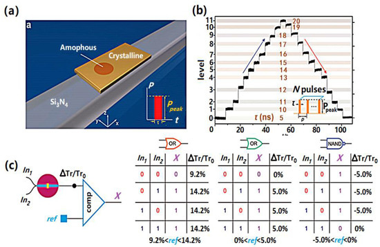 Apart from the above, phase-change memories can also be used optically to realize Boolean logic functions [131] (see Figure 13). This novel all-photonic device uses GST media as the active layer, coated with an ITO (Indium Tin Oxide) film to protect it from oxidation. These two layers are deposited over a half-etched waveguide on a Si3N4 substrate that is optimized for single mode operations. To record data, an intense light is propagated through the waveguide and the resulting energy, particularly the evanescent electric field, is partly absorbed by the GST media. The required phase transition can therefore be accomplished once the temperature inside the GST media reaches either ~400 °C for fast crystallization or melting point for amorphization. The readout mechanism for this photonic device relies on the significant difference in the refractive index between the crystalline and amorphous phases. Experimental results show that amorphous GST has a lower attenuation and higher light transmission than its crystalline phase. Thus, the device transmission coefficient, measured by a low power optical pulse, is significantly enhanced when forming the amorphous element, whereas a lower transmission coefficient is detected when producing a crystalline one. If this mechanism is adopted, a series of device transmission values can be obtained by continuously changing the magnitude and width of the optical excitation, enabling multi-level recording. Optical pulses with three different widths can be set as ‘reset’, ‘input 0’, and ‘input 1’. To perform logic operations, the device can initially be reset to a pre-defined transmission value using a reset signal. This pre-defined transmission value will remain unchanged unless the two input signals include at least one input value of ‘1’. ‘OR’ logic can be thus be realized by using a reference transmission between the pre-defined value and the one resulting from an input ‘1’ signal.