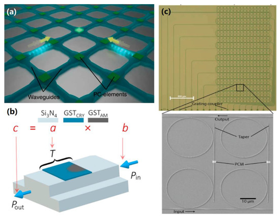 (a) Sketch of a waveguide crossing array illustrating the two-pulse addressing of individual phase-change cells. Only overlapping pulses provide sufficient power to switch a desired PCM-cell; (b) scheme of the multiplication of two scalars a and b, codified in the device transmittance T and in the energy of the read pulse Pin; (c) 16 × 16 cell photonic matrix memory showing optical micrograph of the memory cells (top) and SEM of a single cell within the array (bottom). ((a) is reprinted with permission from [133]; (b) is reprinted with permission from [134], and (c) is reprinted with permission from [135]).