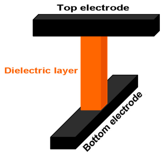 Resistive RAM (RRAM or ReRAM) basically makes use of a simple metal-insulator-metal (MIM) architecture (see Figure 15), with a dielectric layer being sandwiched between two metal electrodes. The most attractive feature of RRAM is that a dielectric layer that is subjected to external electrical excitations can be reversibly and rapidly switched between high and low resistance states, just as is the case with PCRAM. There is still some controversy surrounding the resistance switching (RS) phenomena found in various resistive materials, such as transition metal oxide, organic polymer composites, graphene oxide, and selenides. Several hypotheses have been put forward regarding the RS mechanism of these materials, including valence change memory (VCM) [140,141,142], electrochemical metallization memory (ECMM) [143,144,145], and thermochemical memory [146,147,148] (see Figure 16).