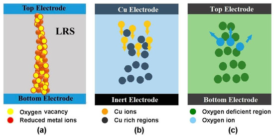 Resistive switching mechanism for: (a) VCM (valence change memory); (b) ECMM (electrochemical metallization memory); and (c) thermochemical memory ((a) is reprinted with permission from [148]; (b,c) are reprinted with permission from [64]).