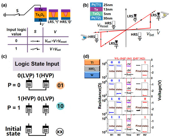 In relation to in-memory logic operations, the LRS and HRS of RRAM perfectly match the binary digits ‘1’ and ‘0’, renders it suitable for in-memory computation. One practical scheme to realize in-memory computing of logic operations for RRAM is to develop a hybrid device with one switch and one unipolar Ta2O5-based RRAM cell [154] (see Figure 17a). The switch’s physical state and the external voltage can be considered as input logic signals. Thus, the ‘on’ and ‘off’ states of the switch can correspond to the input logic values of ‘0’ and ‘1’, respectively, while, for the external voltage, the input logic values of ‘0’ and ‘1’ can refer to writing the RRAM cell into comparable states of ‘0’ and ‘1’, respectively. The non-volatile HRS and LRS of an RRAM cell can indicate output values of ‘0’ and ‘1’, respectively. Thus, a logic combination of input (01) can enable the switching of the RRAM from a ‘0’ to a ‘1’ state, while maintaining a ‘0’ state the other three combinations (00, 10, and 11) are encountered. Switching from an output state of ‘0’ to ‘1’ can be achieved by using the 00 input combination, while the other three input configurations will not change the memory state. This allows for the production of 14 of the 16 Boolean logic functions in no more than three sequential write cycles.