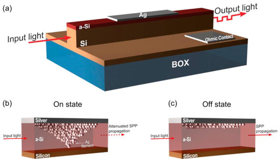 The key feature of RRAM is the similarity of its electrical behavior to that of a ‘memristor’. This endows RRAM with the capacity to realize material implication (IMP) logic. This offers a number of advantages, such as non-volatility, functional completeness, high compactness, and the symmetry of the two inputs for a binary function. Basically, two RRAM (considered as memristors here) are selected by a common shared word line and two bit lines. Applying a positive voltage higher than the ‘SET’ value and a negative voltage higher than the ‘RESET’ value can switch the RRAM from an HRS to an LRS and vice versa. The initial resistive states of the two memristors indicate the logic inputs for binary computation. During logic operations, VCOND and VSET are simultaneously applied on bit line 1 and bit line 2, respectively. The logic result stored inside the RRAM then corresponds to its final resistance. As this scheme uses two RRAM in the same word line, it is usually called WL-IMP. A different approach to WL-IMP was recently proposed that implements two RRAM in the same bit line, leading to it being called BL-IMP. BL-IMP presents an analogue circuit configuration to WL-IMP, apart from the voltage polarity. The feasibility of using these two schemes to achieve important Boolean functions has been proven experimentally. In one notable case, a 2 × 2 Ti/HfO2/W RRAM array [157] was used to execute logic computation and apply logic inputs (i.e., VCOND and VSET in either positive or negative polarity) to two working RRAM, followed by a read process to detect the correct logic output (see Figure 17d). This method enables the 16 binary Boolean logic functions to be reprogrammed in one small single cell with superb performance. Differing from the aforementioned electrically writable and readable RRAMs, one novel nanoscale plasmonic memristor that can be written and re-written electrically but read optically was also devised, as illustrated in Figure 18. The designed device comprises a vertical Ag/a-Si/p-Si butt-coupled to a single-mode SOI waveguide where light is propagated. As light propagates through such a device, it couples mainly to the fundamental plasmonic mode, highly confined at the Ag/a-Si interface. The formation and rupture of the conductive Ag filament inside a-Si can greatly change the optical transmission of the RRAM device, enabling its readout functionality [158].
