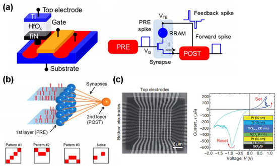 Another fascinating feature of RRAM arises from its ability to construct the so-called spike neural networks (SNNs) that can closely imitate the storing and computing functionalities of the biological brain. One strategy is to take advantage of a Ti/HfOx/TiN RRAM based on 1T1R configuration [165], as illustrated in Figure 19a. The possibility of realizing the well-known spike-timing-dependent-plasticity (STDP) behavior using the designed 1T1R synapse was also verified. In addition to the emulation of the STDP mechanism, the RRAM-based SNNs were also implemented for unsupervised learning of visual patterns in hardware [166], as shown in Figure 19b. Pattern learning experiment is based on three sequential phase where only one 4 × 4 visual pattern among Pattern #1, Pattern #2, and Pattern #3 is submitted to the input layer, and was conducted using a stochastic approach. Note that above RRAM-based SNNs generally adopt a concept of overlap-based synapse. Recently, a concept of non-overlap ReRAM-based synapse was also presented [167], exemplified by a Pt/Ta2O5-x/TaOy/Pd RRAM device. Adjusting the sequence of the pre-and post-synaptic spikes gives rise to the analogous STDP behavior to the observed biological phenomenon as well as the numerically calculation outcomes. In spite of these impressive studies, hardware implementation of the neuromorphic system still remains challenging due to the extremely complexity of the human brain that contains ~ 1014 synapses. One promising scenario to provide the similar degree of complexity is to implement a so-called cross-bar architecture where a two-terminal resistive device (i.e., memristor) is located at each cross-point. It should be noticed that conventional cross-bar neural networks still adopt an additional transistor at each cross-point, which severely impairs their scalability. To overcome this limit, a transistor-free metal-oxide memristor with Pt/Al2O3/TiO2-x/Pt stack [168], as described in Figure 19c, was recently reported to achieve a successful operation of a simple integrated neural network having one single layer perceptron, thus paving the path toward the effective analog-hardware realization of much more complex neuromorphic networks.