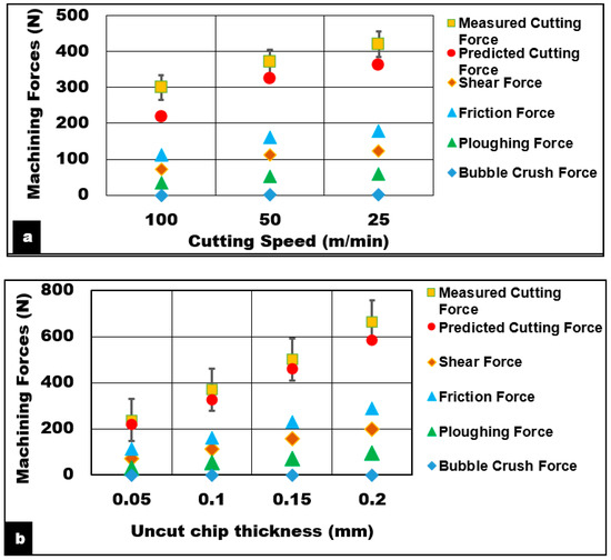 Effect of process parameters (speed and uncut chip thickness) on the variations in cutting forces during machining AZ31 magnesium foam reinforced with a 15% volume of alumina hollow bubbles is shown in Figure 2. The contribution of various mechanisms towards the total cutting force component is shown in detail. It can be seen from the results that an increase in cutting speed leads to a decrease in generated cutting forces by up to 120 N. However, the opposite was observed for changes in uncut chip thickness where the cutting forces showed an increasing trend. The friction force was found to be the major component of all cutting conditions tested in this study. The magnitude of friction force increased with increasing feed and decreasing cutting speed as shown in Figure 2.