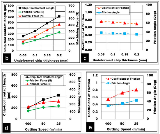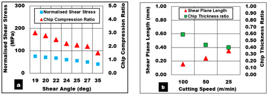 These findings are in line with the results shown in Figure 3a, where the normalized shear stress drops almost by a factor of 2 from 80 MPa to 39 MPa when the cutting speed (which is associated with strain rate factor) is increased from 25 m/min to 100 m/min accompanied by a rise in temperature along the shear zone. As seen in Figure 3b, a rise in cutting speed leads to a drop in chip thickness, hence increasing the chip thickness ratio with shortened shear plane length and steeper shear angles. As a result, a fall in shear stress required to separate the chip from the workpiece is also noted.