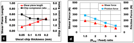Relationship between various cutting parameters. (a) Effect of increasing shear angle on shear stress and chip compression ratio, (b) Effect of cutting speed on shear plane length and chip compression ratio, (feed = 0.1 mm). (c) Effect of uncut chip thickness on shear plane length and chip compression ratio (Vc = 50 m/min), (d) Correlation between (microballoon diameter to feed ratio) with machining forces. (Bubble volume fraction = 15%, b = 3 mm, Dry cut).